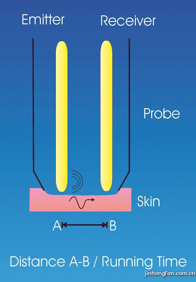 測(cè)試原理是基于共振聲波傳播時(shí)間的測(cè)量。測(cè)量時(shí)探頭內(nèi)部的兩個(gè)針狀傳感器放置于被 測(cè)皮膚表面,一個(gè)傳感器發(fā)出一個(gè)聲音沖擊波信號(hào),另一個(gè)傳感器接收此聲音沖擊波信號(hào)。 由于皮膚表面的水份和彈性的不同,造成聲音沖擊波傳播的速度不同,傳播的時(shí)間也不同。 這樣就可以測(cè)出在不同的皮膚水份和彈性狀況下聲波的傳播時(shí)間。彈性越好、水份充足、皺 紋少的皮膚,其傳播時(shí)間就越短。反之,彈性越差、缺水、皺紋多的皮膚,其傳播時(shí)間就越 長(zhǎng)。在同一個(gè)皮膚位置的不同方向進(jìn)行測(cè)試,還可以判斷出皮膚的纖維組織方向。